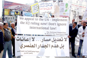La double mobilisation (anti-guerre et anti-mur) a permis la défaite de la doctrine de Bush et Sharon Le 26 10 2004 [...] La manière dont Israël a décidé et construit son 'Mur' a entraîné le même processus de refus, articulé sur le précédent [la mobilisation contre la guerre en Irak et le refus de l'ONU de la valider]. Il est apparu en effet de plus en plus clair aux yeux de l'opinion, touchée à des degrés divers par la campagne contre le Mur, que le droit international établit des obligations claires pour la puissance occupante concernant les intérêts de la population civile occupée et que ceux-ci ont été violés de manière flagrante avec la construction du mur. Par conséquent, c'est cette double mobilisation : anti-guerre et anti-mur, diffusant à une échelle de masse inédite une conscience publique plus rigoureuse axant la nouvelle culture de la paix sur la nécessité du droit, qui a permis la défaite, au moins sur le plan idéologique, de la doctrine de Bush et Sharon.[...]